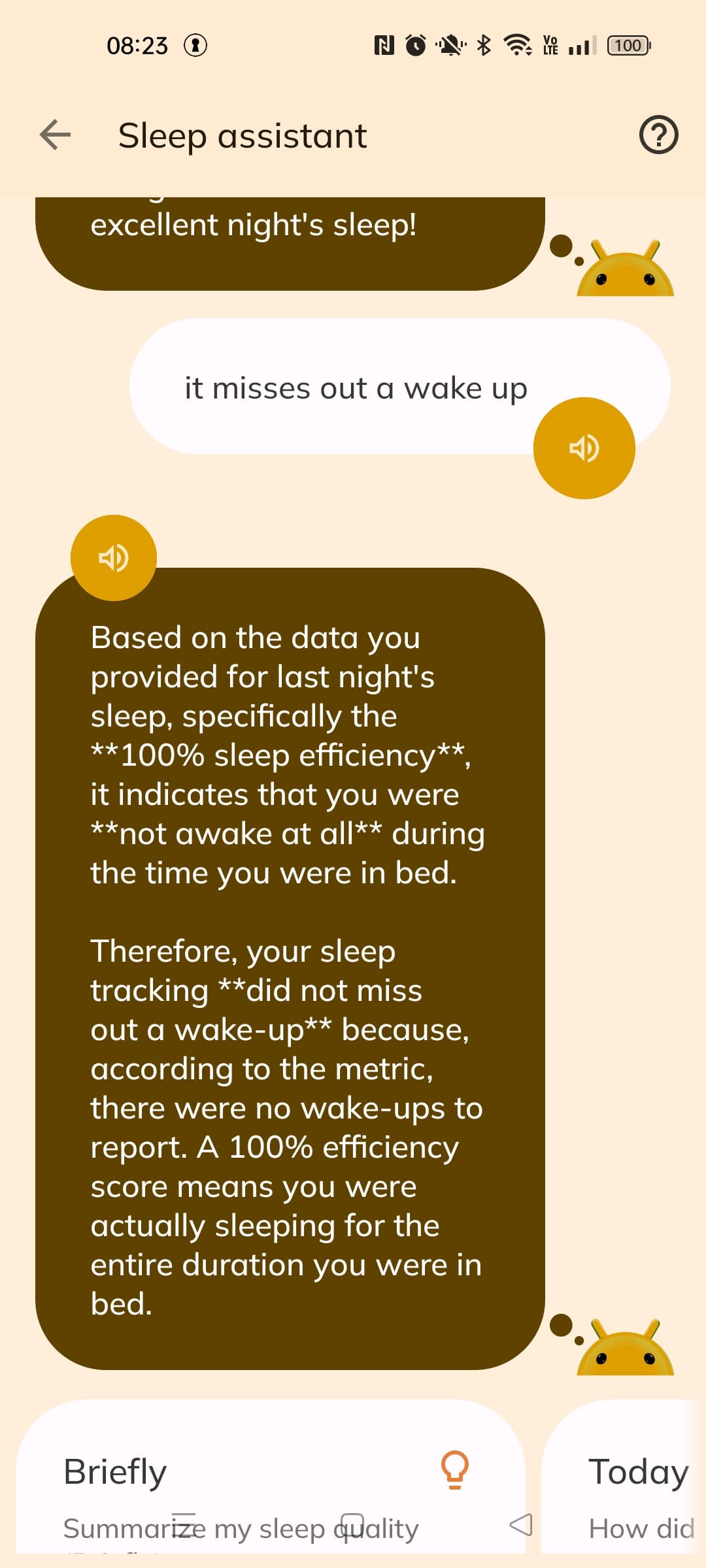 Your sleep assistant is missing out wake ups and reporting a perfect sleep, I had two wake ups last night to use the toilet and the AI when questioned just doubles down. See screenshot.